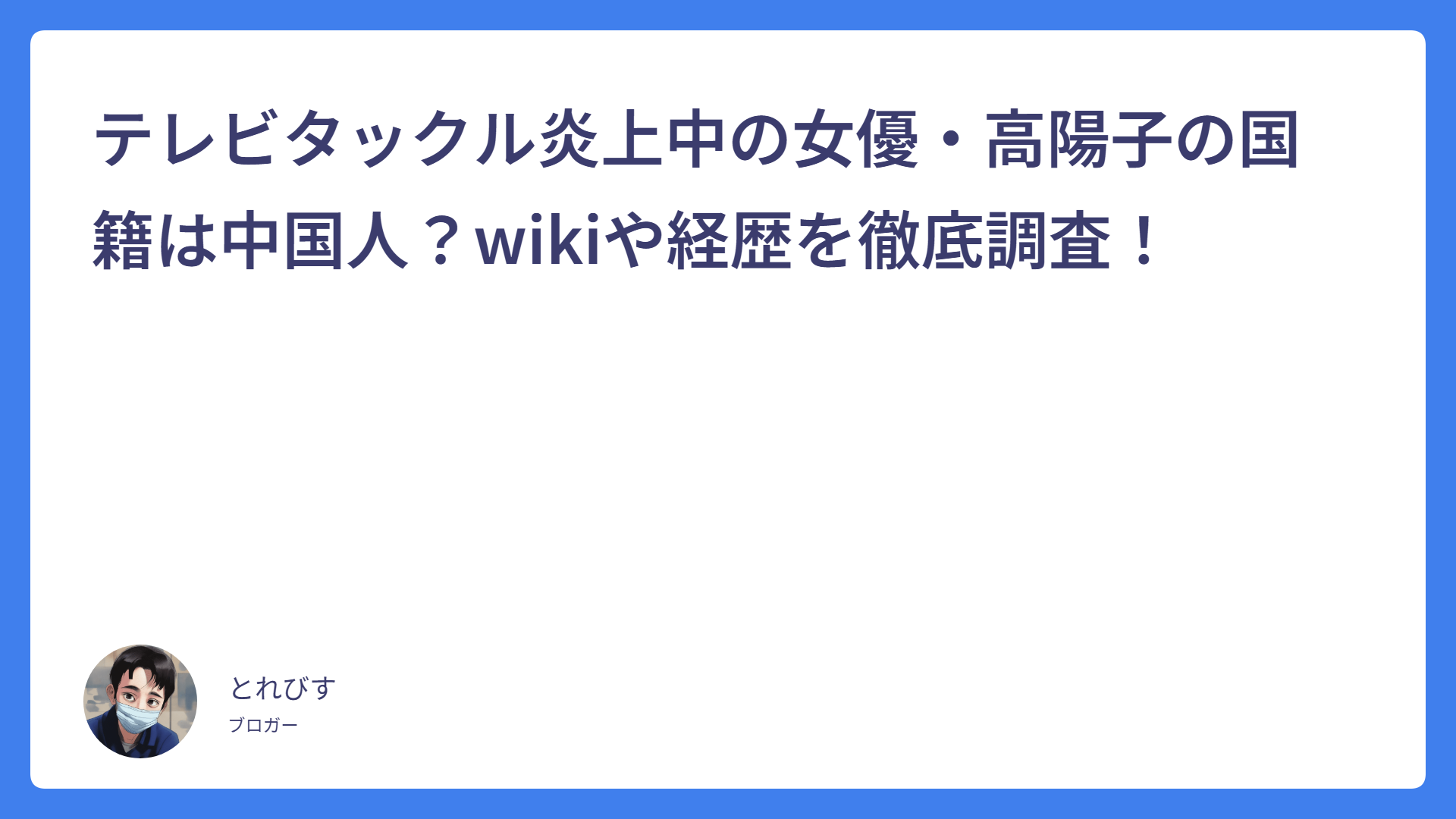 テレビタックル炎上中の女優・高陽子さんは、中国・上海市出身で、国籍は中国(中国籍)です。